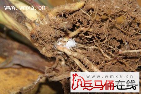 据资料,玉米耕葵粉蚧,属同翅目,粉蚧科,是寄生玉米根部的一种新害虫,主要为害夏玉米幼苗,以若虫和雌成虫群集在近地表的茎基部、根部和叶鞘内刺吸汁液,植株受害后茎基部发黑,根尖变黑腐烂,严重时根茎变粗畸形,不能结实;地上部植株生长矮小细弱,茎叶发黄,叶尖和叶缘干枯,逐渐扩展至整个叶片干枯,严重时整株死亡,对产量影响很大。6月中旬至8月上旬主要为害夏玉米幼苗。该虫除为害玉米外,还为害小麦、谷子、高粱等多种禾本科作物及杂草。请广大群众务必高度重视,立即查治该虫。