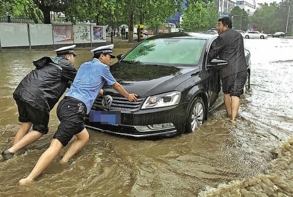 下午15时,雨越下越大,路面积水高达膝盖。在东风大街与新盛路十字有一黑色私家车因路面积水严重,导致车辆抛锚无法正常行驶。这时,正在疏导交通的民警朱军军、张鑫跑过来帮忙推车,推了好几次,才把抛锚车推了出来。