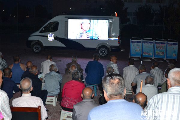 5月25日晚,兴平市公安局交警大队交宣科、事故科民警走进兴平市敬老院,一辆警用带电子屏的宣传车紧跟其后。进了院子,停稳车辆,民警朝老人们喊话:叔叔、婶婶,来看电影了,是你们爱看的老片子!革命老影片开始放映,纳凉的老人们围坐一起,看到高兴处,热烈鼓掌,大声叫好。