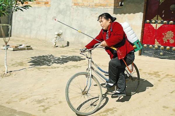 身背数十斤重的打药罐前往农田